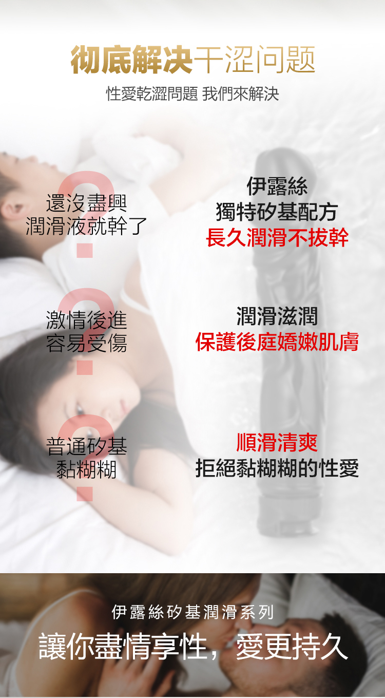 經典矽基潤滑液,配方中不含水,質地更濃厚,潤滑效果更持久,一次持續順滑30分 鐘。仿真陽具造型,潤滑玩樂二合一,不僅是潤滑液,還是陽具自慰棒,一物兩用,超值性價比。性愛乾澀問題我們來解決,伊露絲獨特矽基配方,潤滑、滋潤,保護後庭 嬌嫩肌膚,順滑清爽,拒絕黏糊糊的性愛。防水配方,水中激情也能用,絲滑持久, 獨特配方能形成水潤薄膜,讓肌膚潤滑且不被水分解,水中性愛也能用。開肛緩痛, 保護肛門,矽基潤滑液在使用時會在乾澀的肛周形成薄膜,保護脆弱肛門不受撕裂損 傷。