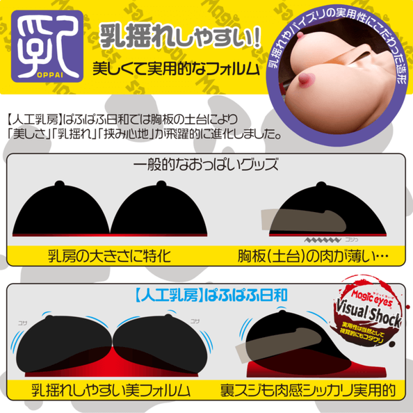 Magic Eyes - 人工乳房 炎炎夏日 3.0 X Cup (ぱふぱふ日和),先要強調這產品不是真正的X Cup,只是原廠也沒資料而已,但的確非常之巨型!產品全日本製造,重量約3kg,採用了三層構造製成,其最大賣點就是極柔軟的觸感,能夠做出乳搖的效果!底部的肉墊刻意加刻,方便用家乳交時使用。
