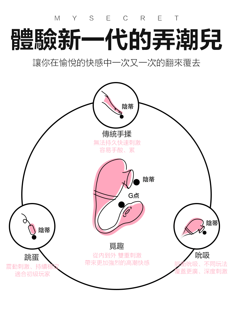 Mytoys - My Secret ,一個強大而小型的吸啜震蛋誕生了,結合了極受歡迎的吸啜功能及原始的震動功能,使用親膚矽膠製造,末端柔軟能夠任意彎曲尋找你最神秘的G點,外部強大的吸啜功能剌激你敏感的陰蒂,配合7段吸啜及10種震動模式,外吸內震,將會為你帶來前所未有的感覺。