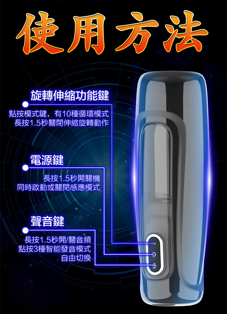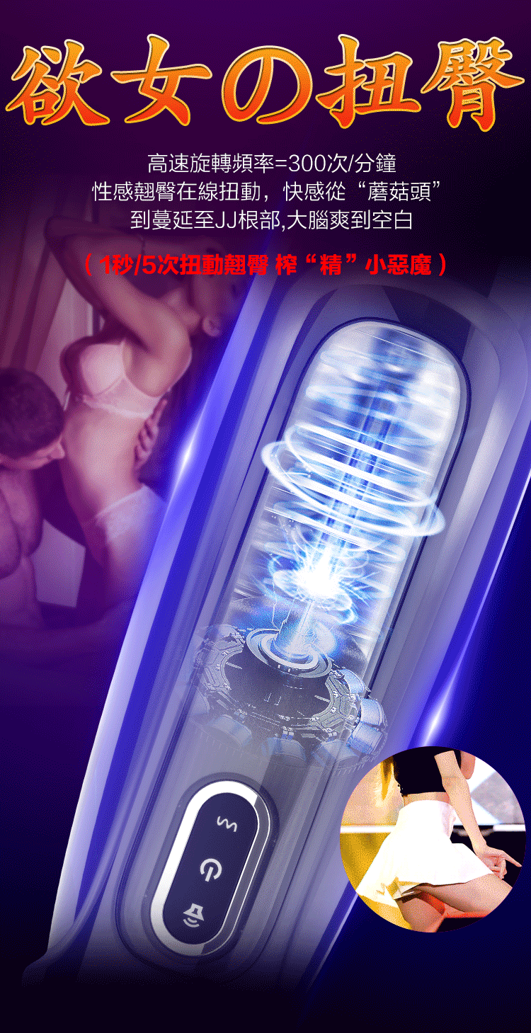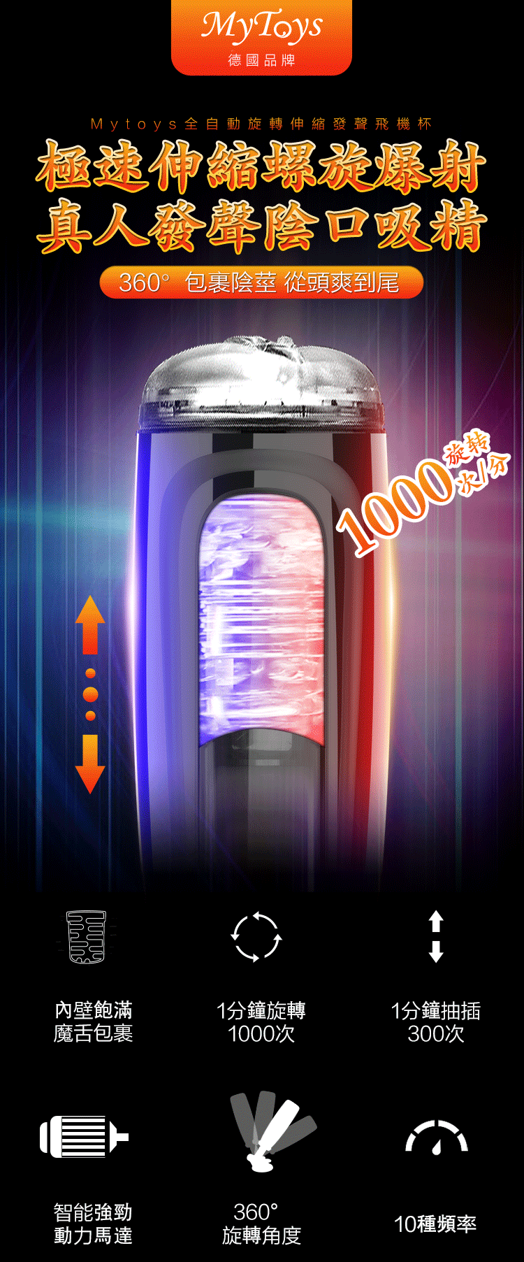 德國品牌Mytoys推出的全方位旋轉自動抽插電動飛機杯,設有10種不同旋轉及抽插模式,令你真正享受到如真人般的享受。內紋複雜剌激但非常柔軟,仿佛像無數柔軟舌頭輕吻你的巨龍。貼心內置3種呻吟聲音(日文),只需插入耳機便可置身場景之中,附送強力吸盤底座,滿足你夢寐中的任何體位。