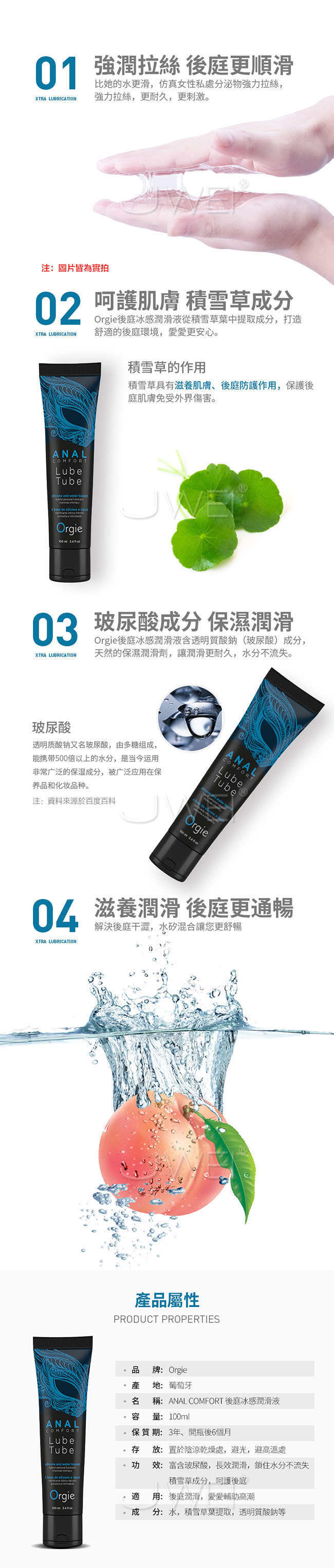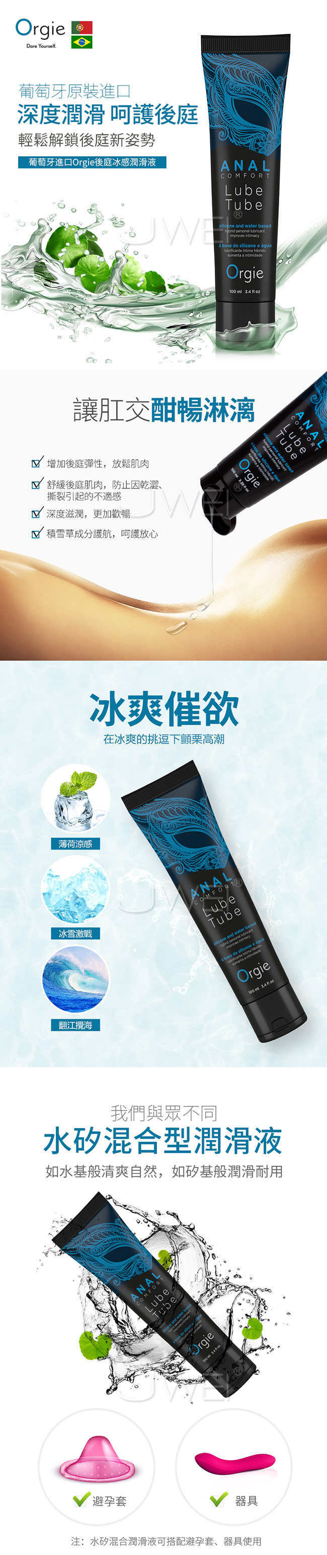Orgie - Anal Comfort  後庭冰感潤滑液能深度潤滑呵護您的後庭,輕鬆解鎖後庭新姿勢。此款為水矽混合型潤華液,如水基般自然,如矽基般潤滑耐用解決後庭乾澀,強潤拉絲如仿真女人私處分泌物更耐久、更刺激。採用天然積雪草具有滋養肌膚,後庭防護作用,保護您的後庭免受外界傷害。加入冰感配方,在冰爽的挑逗下高潮。