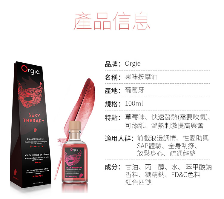 葡萄牙Orgie的性感按摩油,全天然成份製造,清新自然舒爽不剌激,塗上身體後只需要輕輕一吹,溫暖感覺隨即而來,無論是情趣按摩或是前戲調情都非常適合,附送的調情羽毛非常適合配合按摩油作挑逗神經,瞬間激發性慾。