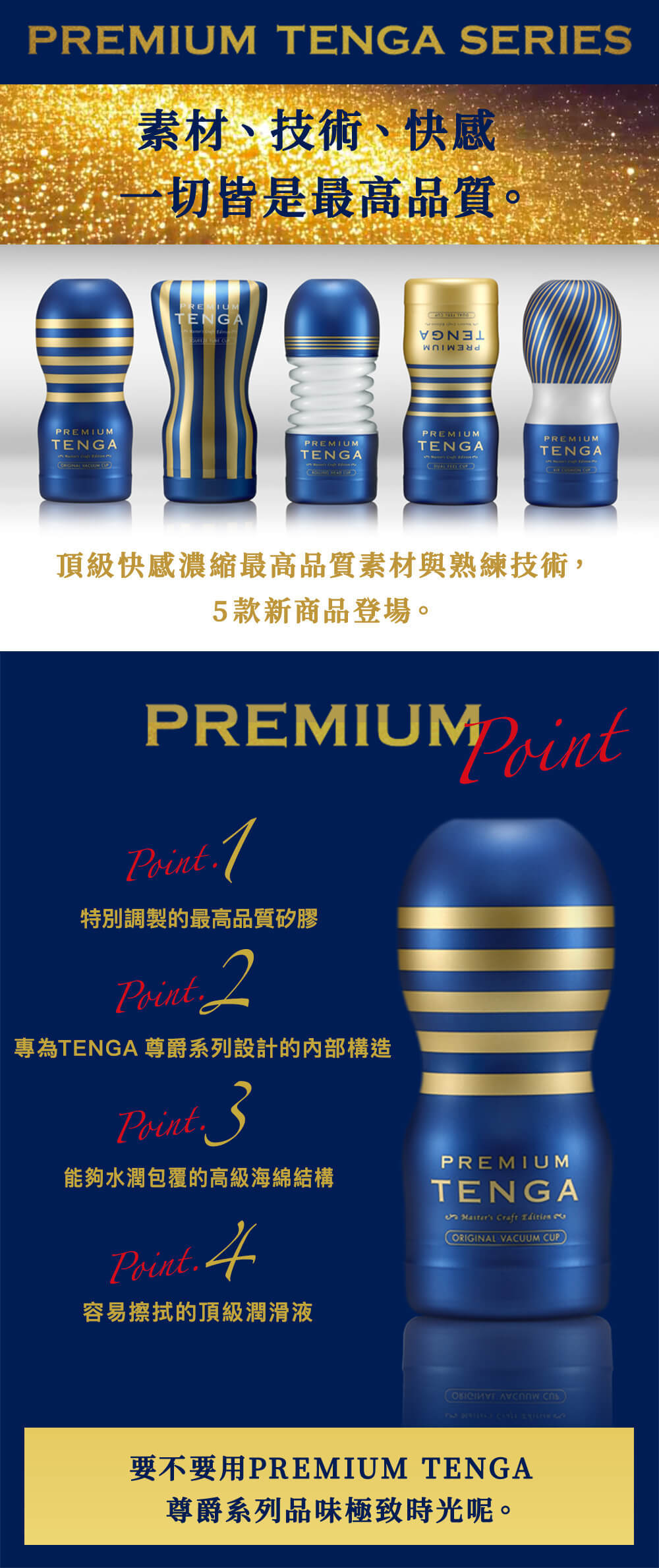 PREMIUM TENGA SERIES豪華杯系列,由甄別嚴選的頂級材料和十五年爐火純青的熟練技術製成。
