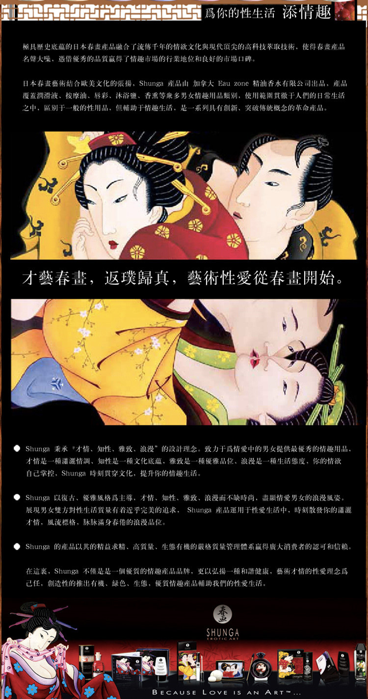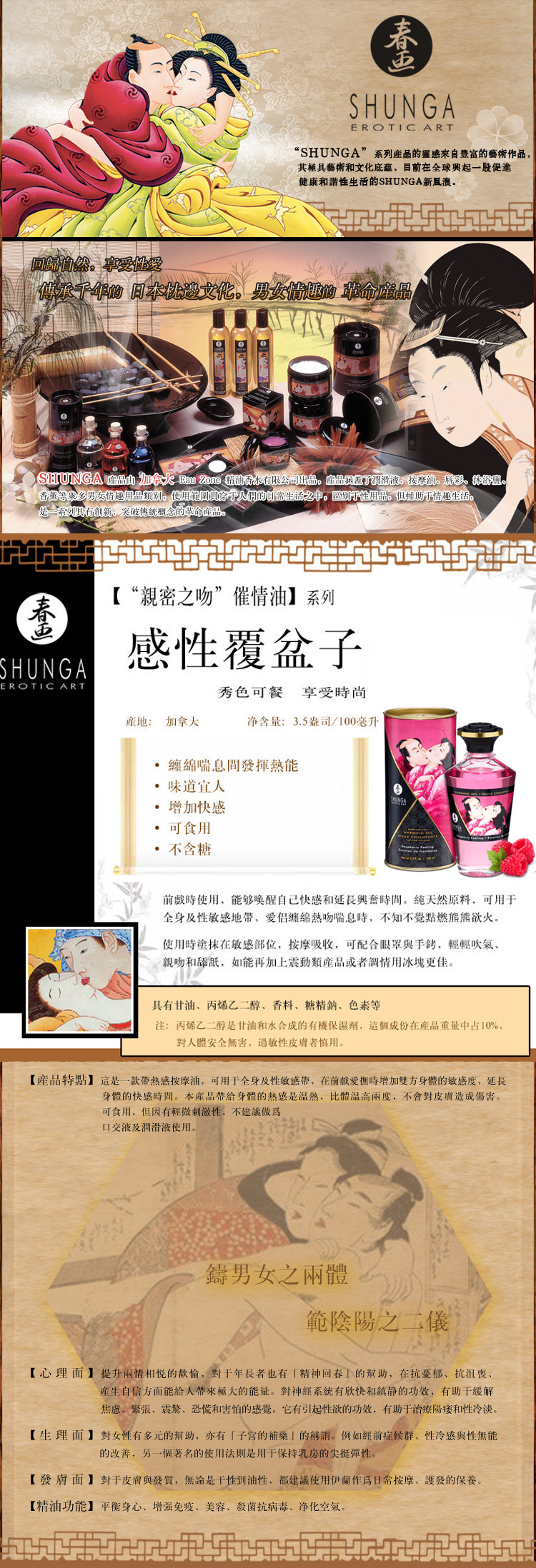 加拿大品牌Shunga出品的全新可食用熱感按摩油系列,可用於全身及性敏感帶,在按摩愛撫時增加雙方身體的敏感永及延長快感時間。純天然原料,纏綿喘息時,不知不覺點燃熊熊欲火。
