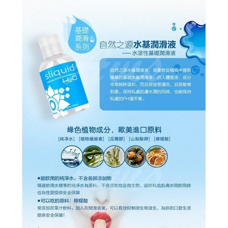 Sliquid - Naturals H2O 天然水基潤滑液,是一款從植物中提取精華的基礎水基潤滑液,仿人體愛液,成份非常純粹溫和,而且容易清洗,且低敏無剌激不含甘油。保持私處肌膚水潤的同時,也能保持私處的PH值平衡。