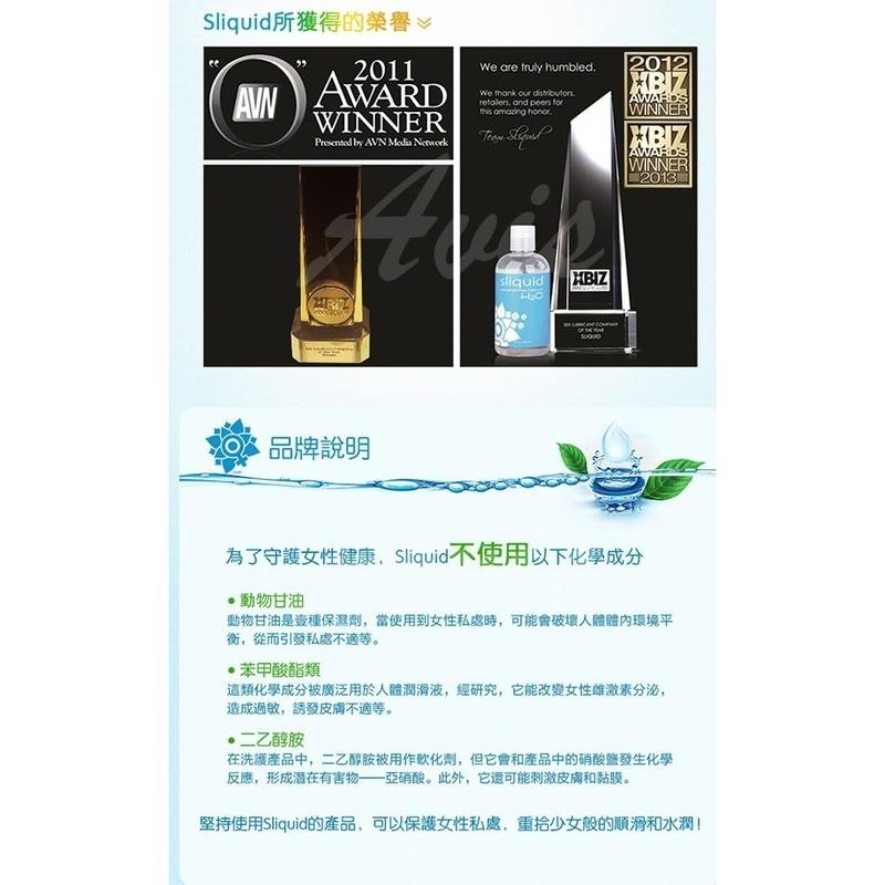 美國Sliquid潤滑液榮獲2009美國成人用品奧斯卡- AVN大獎的最佳潤滑液獎(O Awards 2009),為美國著名潤滑液品牌。