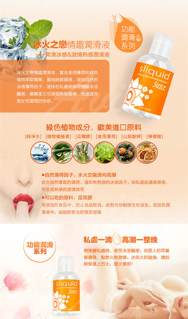 Sliquid - Naturals Sizzle 冰火之戀潤滑液富含食用薄荷和綠色植物精華,質地絲般順滑。源自天然的冰感薄荷因子,塗抹在私處後瞬間體驗冰涼觸感,摩擦後又可感受熱辣激情,快速提升男女性愛間的快感。
