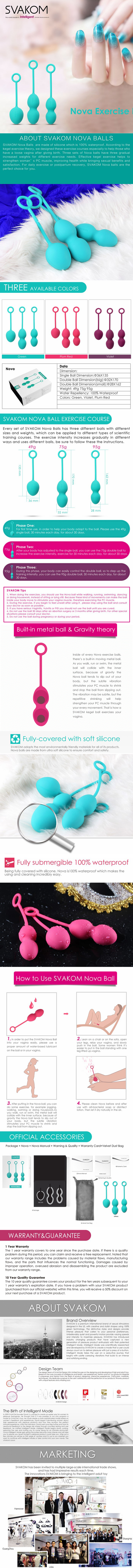 SVAKOM收陰球是一套專業設計的三個不同的收陰球,用於進行凱格爾運動練習。每個球都配有矽膠繩,使用後可輕鬆取出球。整個Nova球由100%防水的身體安全矽膠製成。根據凱格爾運動理論,我們設計了這些凱格爾運動課程,特別是為了幫助那些想要在分娩後收緊陰道的人。這組Nova球有三個逐漸增加的重量,以滿足不同的運動需求。有效的凱格爾運動有助於增強女性的陰道肌肉(恥骨尾骨肌),改善陰道健康和可改警尿滲,同時帶來性快感和滿足感。對於日常鍛煉或產後恢復,Nova收陰球是您增強陰道肌肉強化需求的最佳選擇。