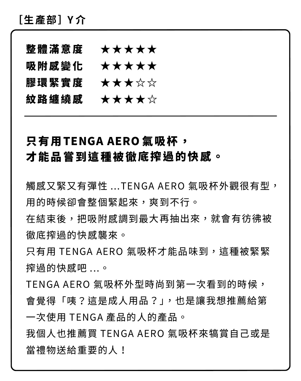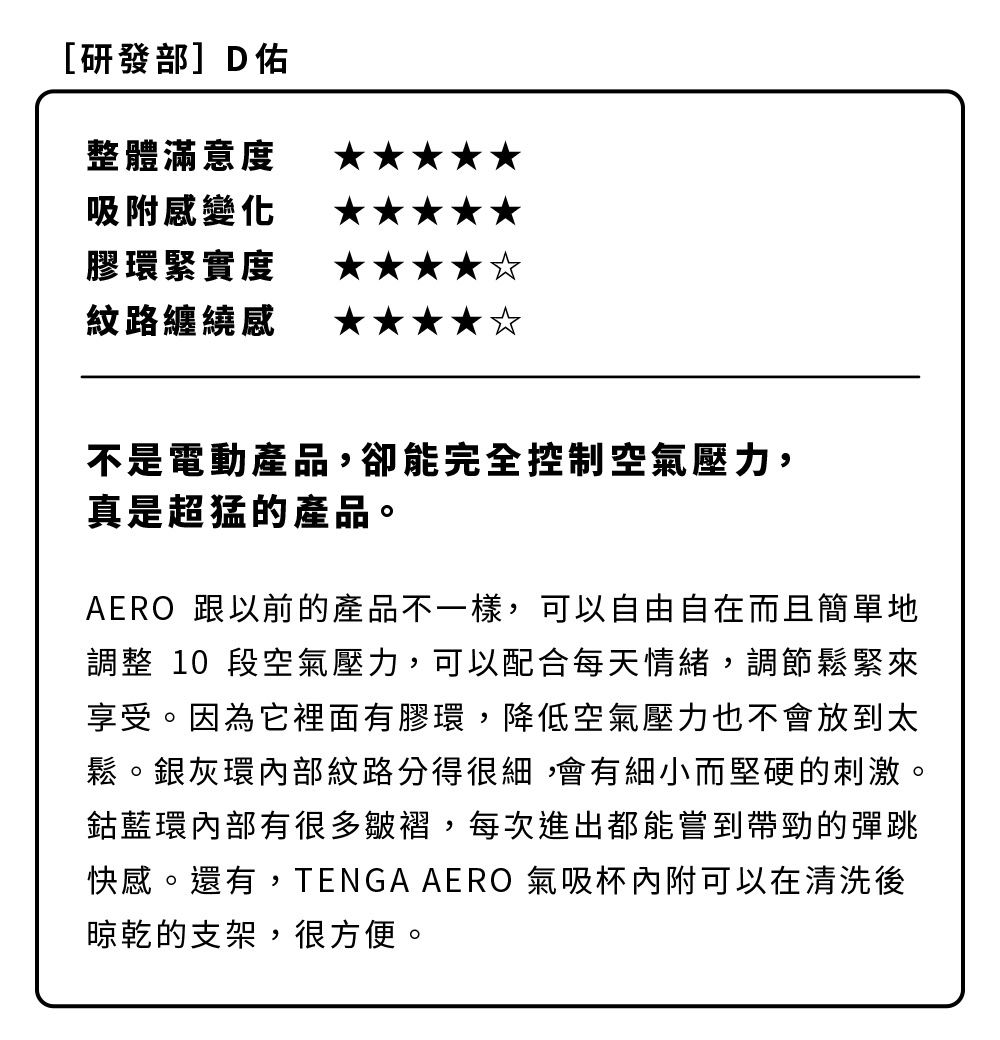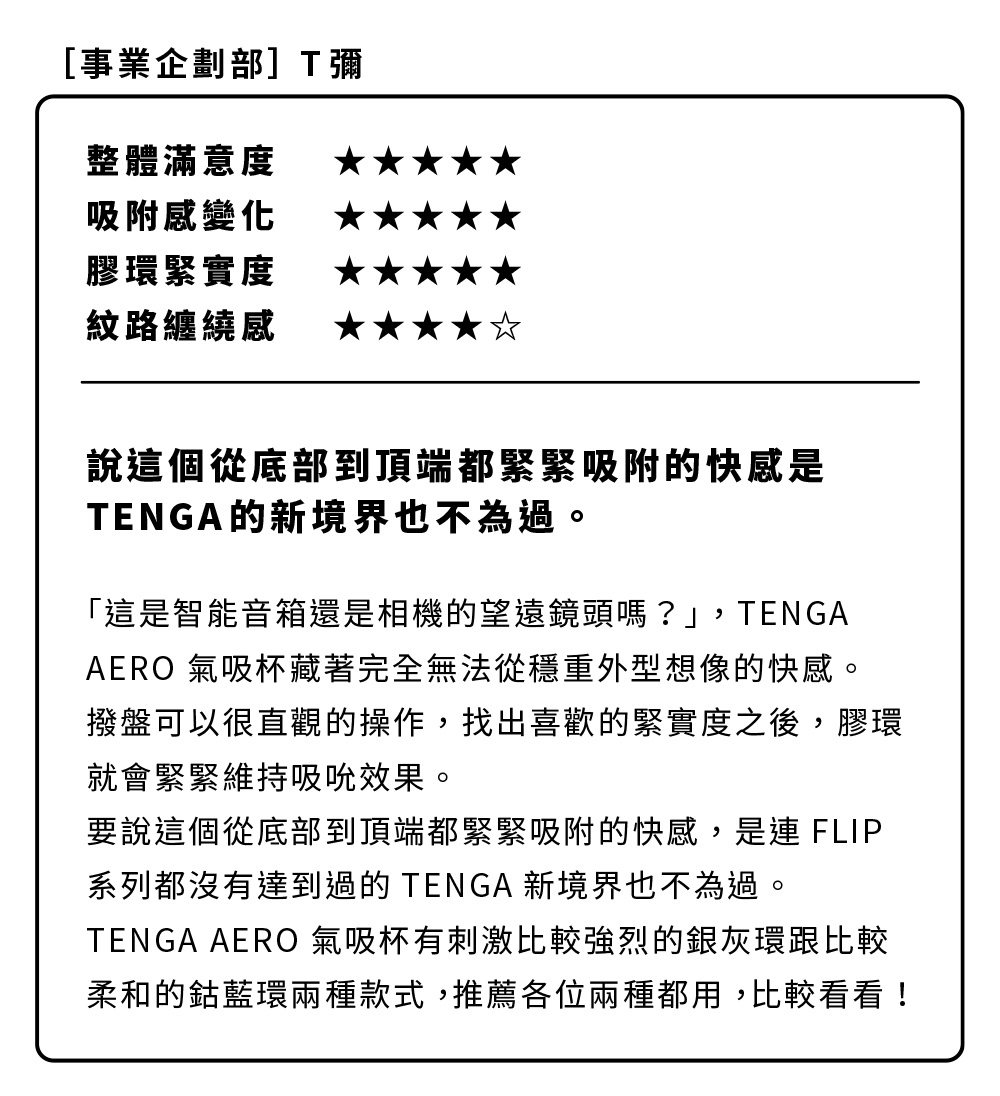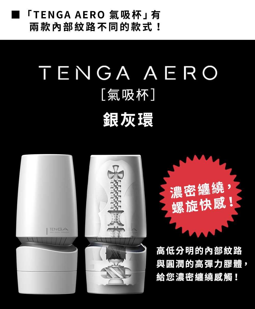 Tenga的最新的創新使用家能體會到非常滿意感覺。全新的Tenga - Aero Silver Ring 氣壓式重複使用飛機杯具有十級真空度和鬆緊度調節功能。只要扭動杯身,便可一級級地調較吸啜力道,可讓您找到最適合自己的設置。而Silver Ring 是一款以緊密的磨擦和糾結的螺旋結構以讓你感到極具刺激的體驗。