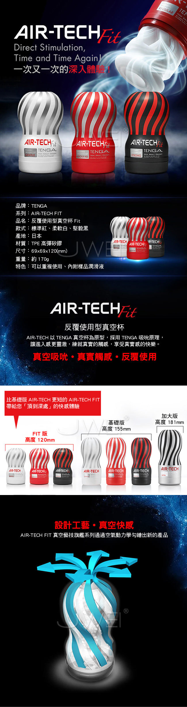 Tenga 大受歡迎的AIR-TECH飛機杯推出最新的Fit版!! 體形更小更可愛! 內部長約10cm,恰到好處,190克的重量,長時間使用亦不會覺得疲累。強勁的氣壓技藝,只要把頭頂的氣孔用手指覆蓋,就能產生強勁啜效果,玩樂後亦可把內膽整個拆出清洗,非常方便。
