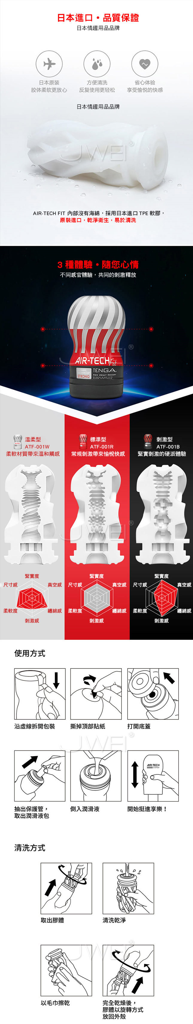Tenga 大受歡迎的AIR-TECH飛機杯推出最新的Fit版!! 體形更少更可愛! 內部長約10cm,恰到好處,190克的重量,長時間使用亦不會覺得疲累。強勁的氣壓技藝,只要把頭頂的氣孔用手指覆蓋,就能產生強勁啜效果,玩樂後亦可把內膽整個拆出清洗,非常方便。此款為3款之中的緊實版,是一款強勁的小型搾精飛機杯,強硬緊實的素材能觸及你的忍耐極限,帶給你最強烈的高潮體驗。