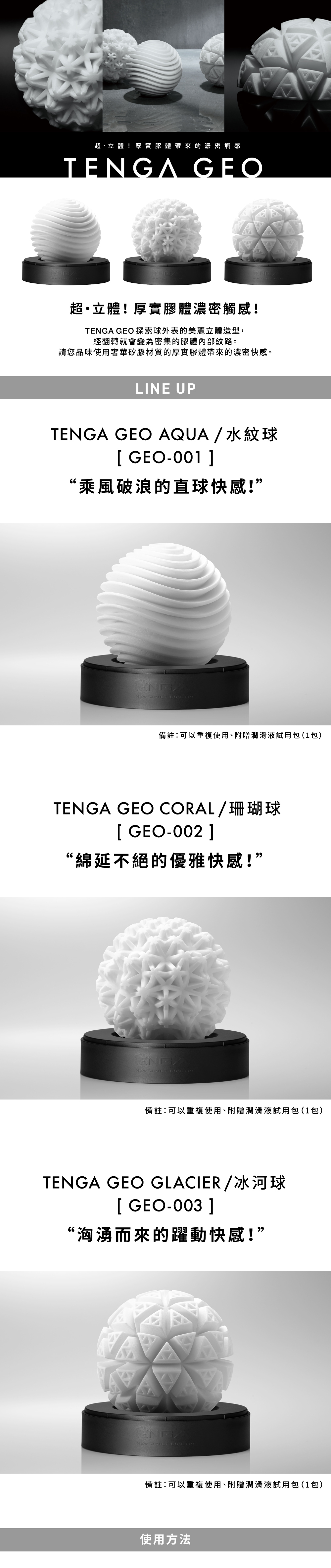 Tenga 2020年又一力作,將飛機杯的層次再推上一步,使飛機杯更為美觀,更為有感~以星球為創作靈感,推出全新的Tenga Geo 系列飛機杯。不要以為它像Tenga Egg一樣,整個飛機杯變得更加厚身,更有肉感,更加耐用。只要握在手中,你立刻便能感受軟軟的觸覺。超彈力的素材,能迎合任何大小的尺寸。內紋以激凸的設計,不會像Tenga Egg一樣毫無感覺。配合極具生活品味的包裝,收藏非常方便。