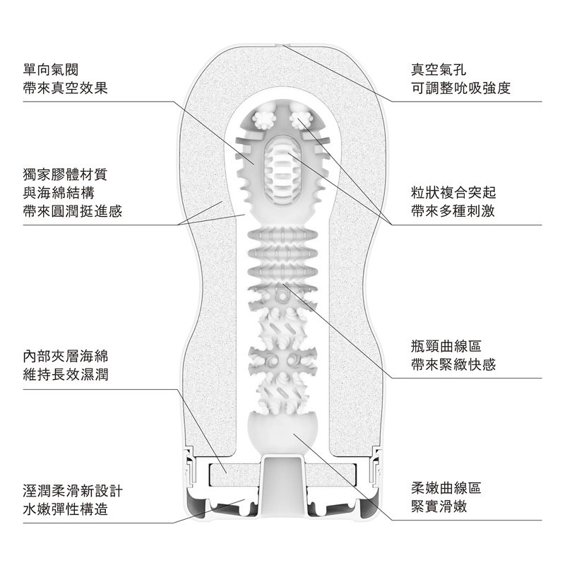 「特殊氣閥構造」可使杯身內部呈現幾近真空的狀態,達到令人歎為觀止的吮吸效果。 「獨家曲線設計」則帶來富彈力的緊緻觸感。 隨著使用過程中的鼓動與聲響,本產品將帶您進入最「深」的吮吸體驗。
